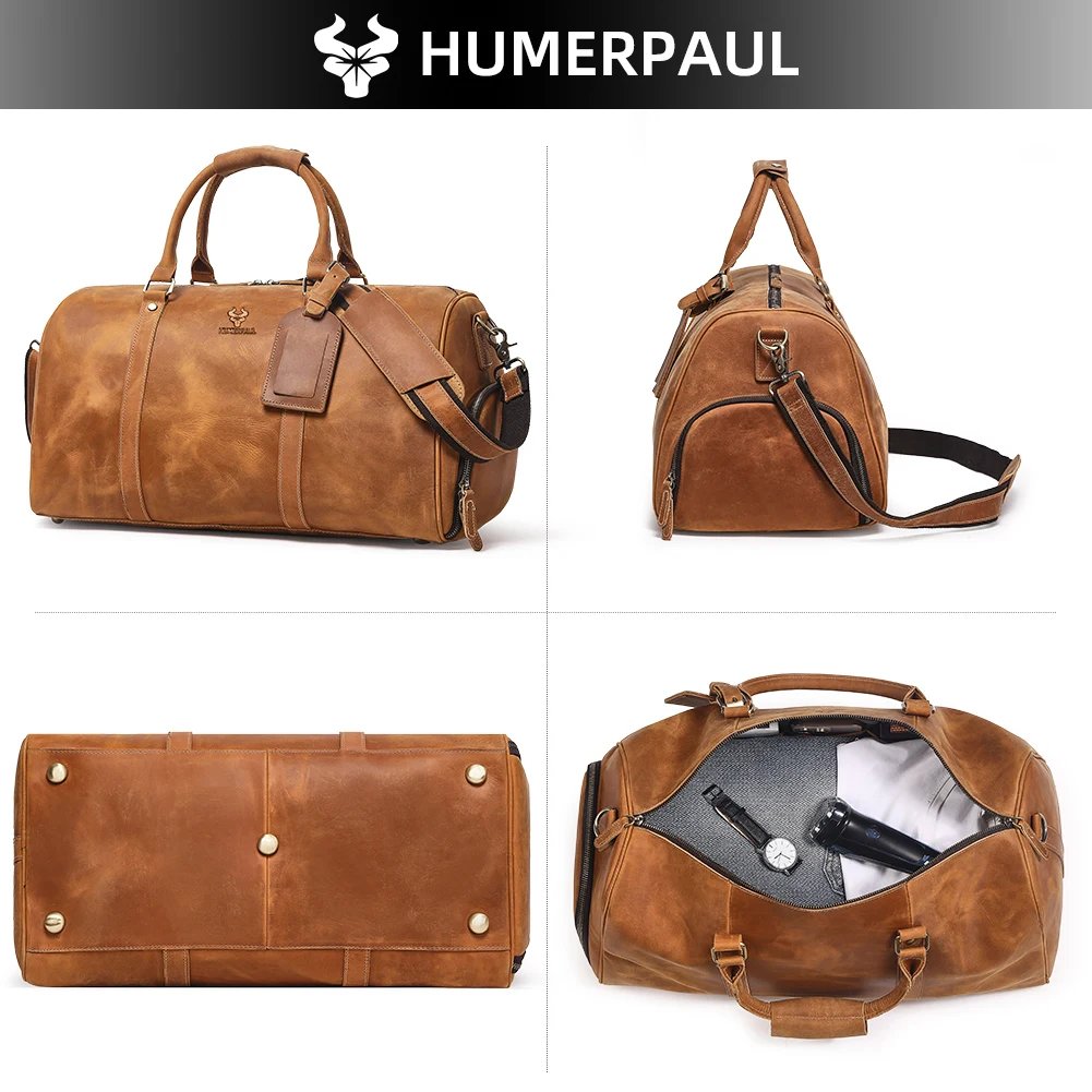 HUMERPAUL Crazy Horse Leather Travel Duffle Bag – Large Capacity for 15” Laptop/A4, Multi – Carry Ways (Crossbody/Shoulder/Hand), Ideal for Weekend Trips, Men’s Luggage